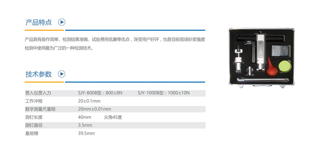 SJY-800B和SJY-1000B型两款强度检测仪,分别适用于砌体砂浆强度检测和混凝土强度检测。贯入法检测是根据测钉贯入砂浆(混凝土)的深度和砂浆(混凝土)抗压强度间的相关关系,采
