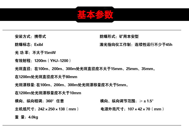 YHJ矿用本安型激光指向仪是集电子、光学、精密机械等技术为一体的仪器。具有外形美观、体积小、重量轻、防爆等特点。仪器通过悬挂组可快速固定在锚杆上,可在360°范围任意粗调,微调准确;调节方便,制动可靠。产品采用自主研发的光学系统,可采用红、绿两种光源,光斑大小、射程满足矿下施工需求。产品配用DC3.6V LH400-D61HC3BRL电源组,不需要在现场接入其他电源,可使仪器广泛用于无交流电源厂